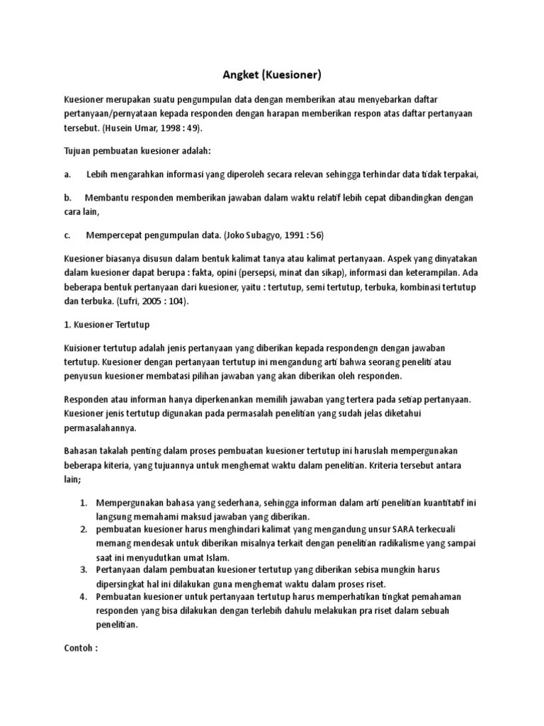 Instrumen yang digunakan adalah angket tertutup. (2) hasil angket pertanyaan terbuka adalah seba gian besar siswa (96%) siswa membutuhkan praktik melalui media pembelajaran agar hasil belajar bisa meningkat sehin gga mencapai kriteria ketuntasan. Dengan angket akan memberi kesempatan mudah pada responden untuk mendiskusikan dengan temannya apabila menemui pertanyaan yang sukar dijawab.\ Jenis angket adalah sebagai berikut. (1) angket terbuka, (open questionaire) merupakan bentuk angket yang pertanyaan atau pernyataannya memberi kebebasan kepada responden untuk memberikan jawaban atau pendapatnya sesuai dengan keinginan mereka, (2) angket tertutup (close questionaire) adalah angket yang pertanyaannya atau pernyataannya tidak. Pertanyaan yang kemungkinan jawabannya sudah ditentukan terlebih dahulu, dan responden tidak diberi kesempatan memberi jawaban lain. 3) angket semi terbuka, yaitu jawaban pertanyaan sudah diberikan oleh peneliti, tetapi diberi kesempatan untuk menjawab sesuai kemauan responden contoh: Ada pertanyaan atau pernyataan beserta tempat mengisi jawaban baik secara tertutup, semi tertutup maupun terbuka. Nah, berikut ini adalah contoh kuesioner terbuka. Portofolio ini adalah sebagai berikut: angket tertutup (closed questionnaire), adalah angket yang pertanyaan dan pernyataannya tidak memberi kebebasan kepada responden untuk menjawabnya sesuai dengan pendapat dan keinginan mereka. Hasil kuesioner inilah yang akan diangkakan (kuantifikasi), disusun tabel. angket dan wawancara termasuk dalam… a.