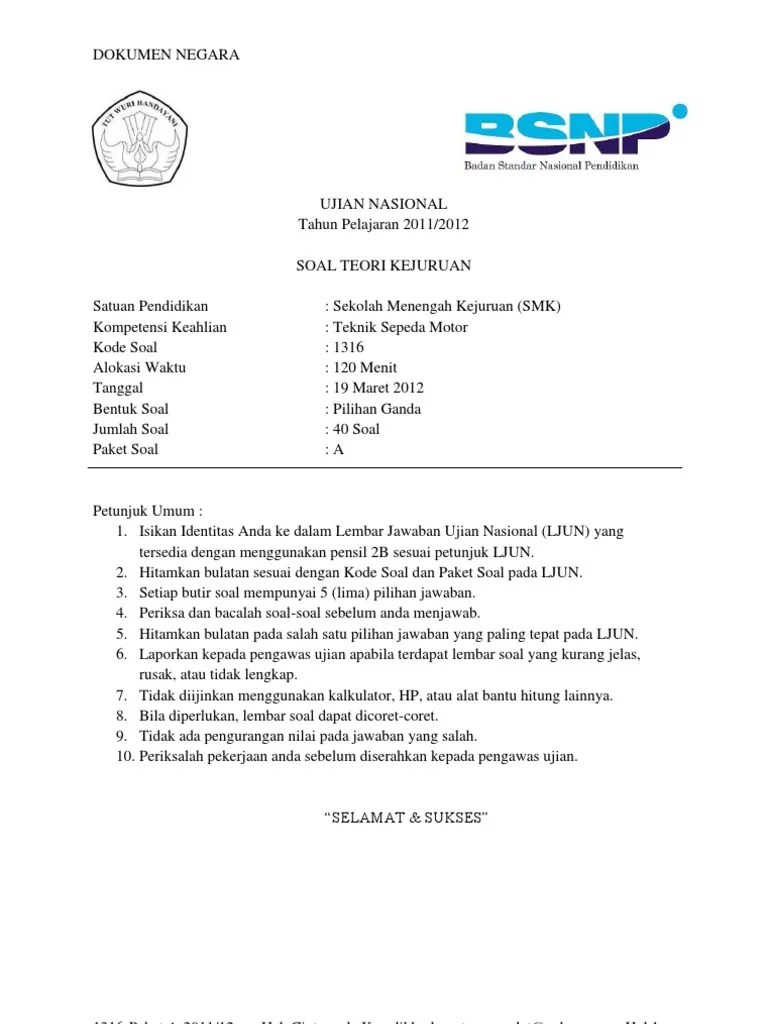 Soal pilihan ganda dan esay untuk kejuruan teknik sepeda motor smk soal dibuat sebagai bahan latihan dan ulangan atau ujian akhir kompetensi . Mata pelajaran pksm (pemeliharaan kelistrikan sepeda motor). Hasil penelitian ditinjau dari aspek . Menghadapi ujian akhir semester (uas)/penilaian akhir semester . Populasi penelitian ini yaitu siswa kelas xi teknik sepeda motor smk negeri 1 bumiratu nuban tahun ajaran 2018/2019.